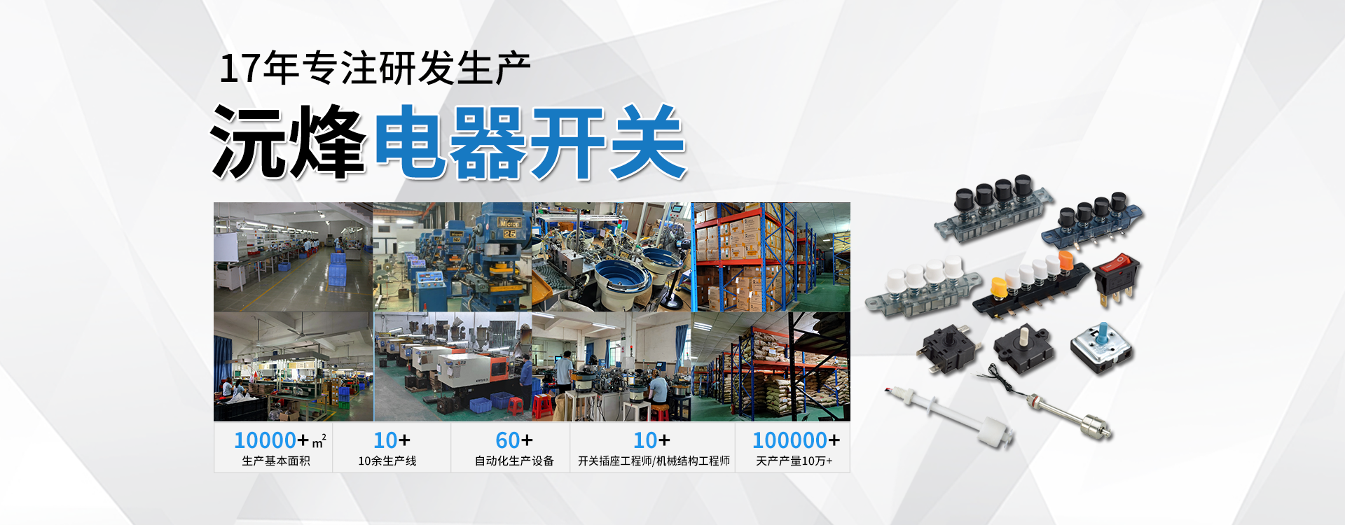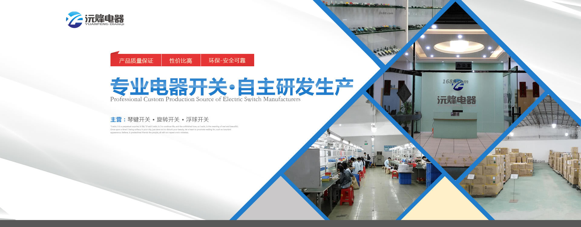 主要生產(chǎn)浮球開關(guān)、接近開關(guān)、琴鍵開關(guān)、旋轉(zhuǎn)開關(guān)、微動(dòng)開關(guān)、船型開關(guān)、拉線開關(guān)以及接線座等系列產(chǎn)品。